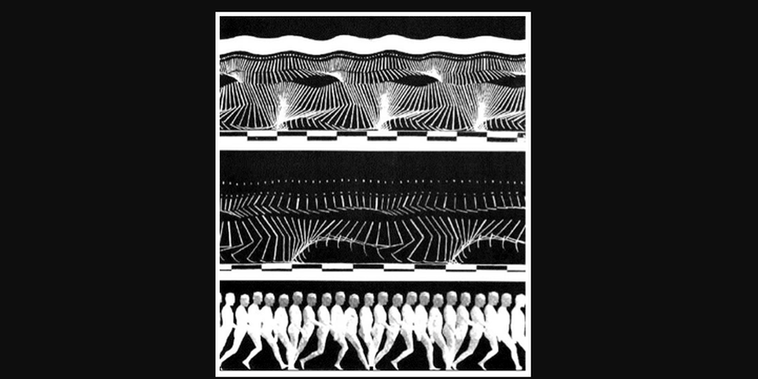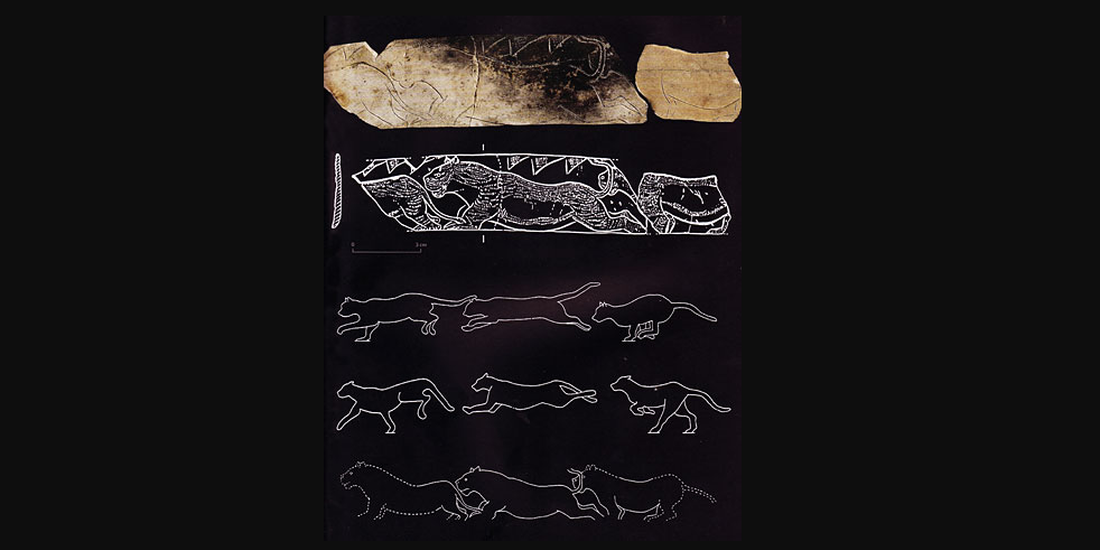El Friso del León hacia el 11.000 a.C. de la cueva de La Vache (Arièges) . Abajo: descomposición del movimiento interno del friso